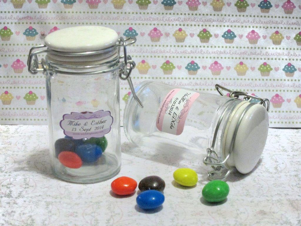 For couples who wants to add their own touch to their wedding favor... this cute candy jar with clip lid is just the wedding for this purpose, packed you unique wrapped candies in this and delight your guest with sweet memories. Price includes standard Thank You sticker. Self Stick. Price does not included candies. Size : 4.4cm x 4.4cm x 8.5cm